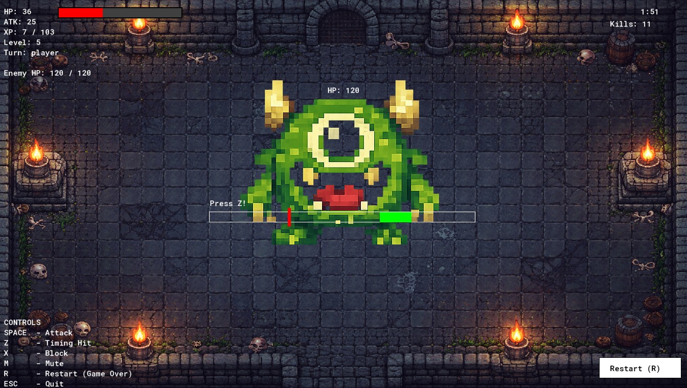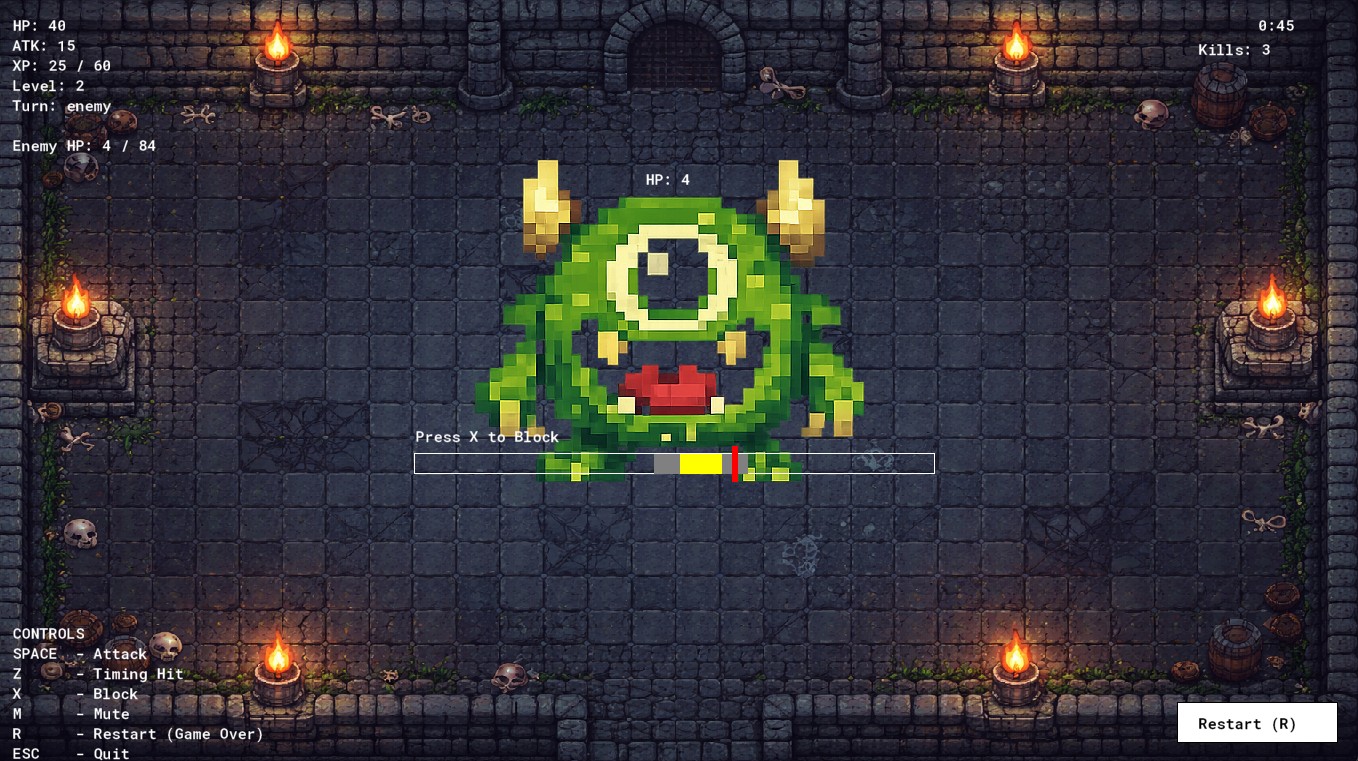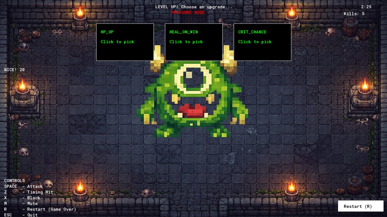 Fight enemies using timed attacks and blocks, level up, and choose upgrades to see how long you can survive.